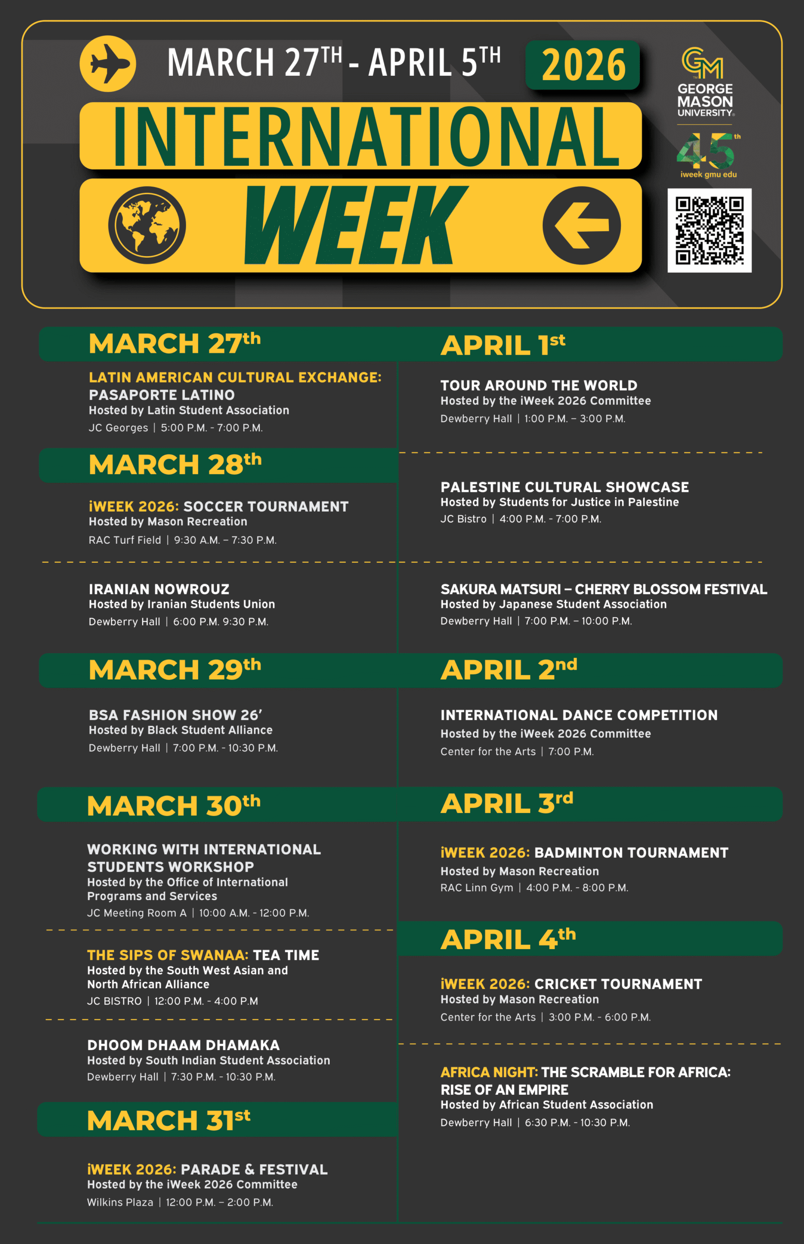 - Each student-organized cultural event is carefully planned to depict different elements of cultures representative of our diverse student body. The events commonly include food, music, dance, and other activities of an international flavor. For more information visit the RSO iWeek Webpage: https://si.gmu.edu/iweek/